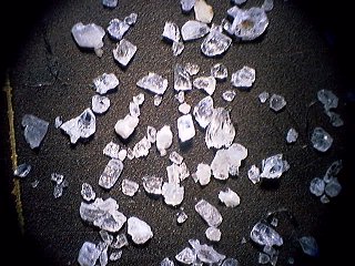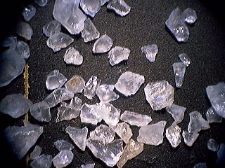 *ペグマタイトの鉱物などを砕いて、劈開(へきかい)の特徴がわかる砂をつくってみました。砂の構成鉱物の鑑定の参考に。 材料は神奈川県教育センター所蔵のものを使用しました。