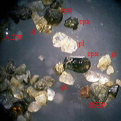 cpx:普通輝石の粒子(中央のグリーン)、pl:斜長石(透明)、岩石片、gl:火山ガラス(白色不透明)など。