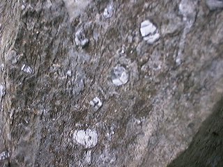 途中、羽黒山手前の山神の石碑に浮き出たウミユリ化石。