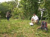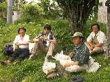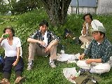 神峰山(598m?/594m)の山頂で昼食。観測所の前の草地で。なぜか前夜の残りの納豆スティックやイカも出現。