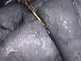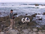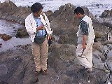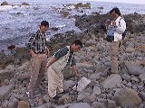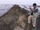 海岸の石のすき間から、棒状アンモナイト化石の露頭をのぞき込む。