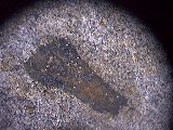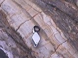 細粒部分に植物化石片の集中した、薄い炭層の部分がある。ルーペのところ。