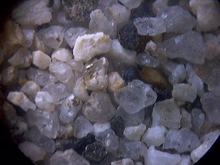 ほとんどが花崗岩由来の砂。石英、カリ長石、斜長石の他、六角形の黒雲母もよくわかる。
