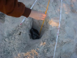 飛砂の採取。風で巻き上げられた砂が斜面に積もっている。粒度分析をすると特徴がある。