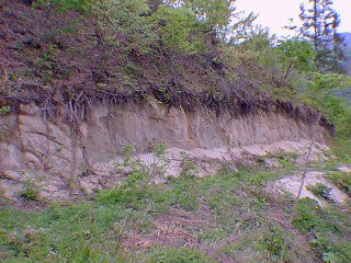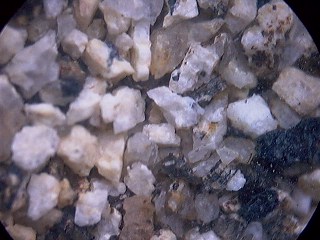 角張った石英、長石、黒雲母などからなる。ほとんど粒子の角が摩耗していない。