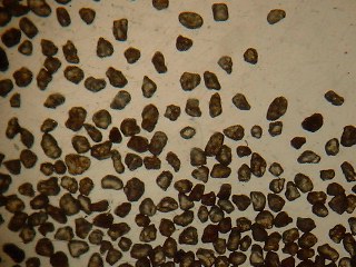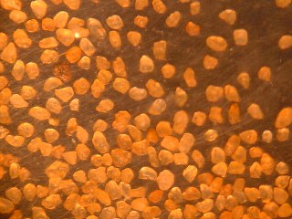 ほとんど石英からなる。砂漠の砂のようだが、やや円磨度が低い。 比較的近いところから供給されたのか。粒度はそろっていて、風で運ばれてきたことを示す。赤い色は酸化鉄の色。