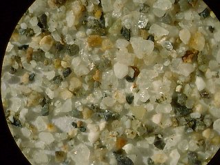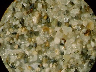 石英の多い、花崗岩質の後背地に由来する砂。ちょっと意外。 岩片は安山岩など、火山岩か。長石が若干入っている。角閃石は花崗岩由来。磁鉄鉱の着いた火山ガラスのような粒子もある。