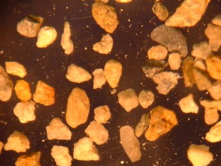 角張った石英の他、花崗岩由来の長石片や、細粒の白雲母を含み片状構造がわかる、 変成岩の破片が目立つ。非常に岩片が多い。上流の地質(おそらく花崗岩−変成岩と中生代頃の堆積岩)を反映しているのだろう。
