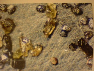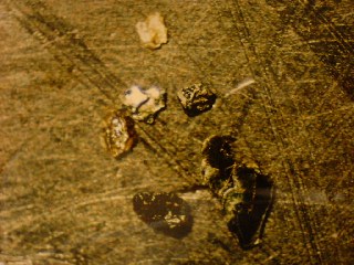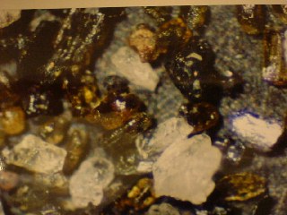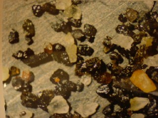 ボタンのような黒色〜銀色の小さな鉱物は磁鉄鉱〜チタン鉄鉱。