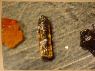 中央の長柱状の結晶がシソ輝石(斜方輝石)。火山噴出物の斑晶由来のもの。