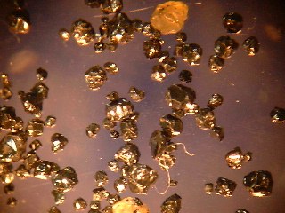 黒く角張ったのがクロムスピネルの粒子。 南アフリカ産としか書いていないが、グレートダイクの超塩基性岩帯に伴う堆積鉱床 あたりに由来するものだろう。