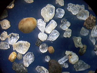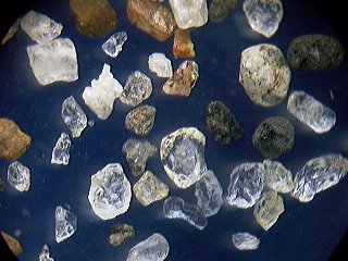 斜長石、高温型石英を主とする砂。透明な鉱物のうち、角張っているのが斜長石。丸っこいのが石英。