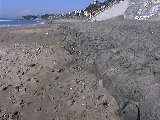 重鉱物砂の産状。引き波で残された重鉱物が黒い層を成している。