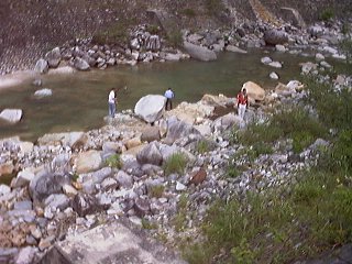 高瀬川の葛温泉付近の河原。基盤岩が露出し、白い砂がその上にたまっている。 川岸の斜面からは