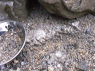 川岸の斜面の砂をすくう。重鉱物が濃集した黒い薄層が断面に見える。