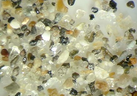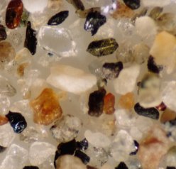石英、長石および岩石片、火山噴出物中の斑晶起源の、輝石類、斜長石、磁鉄鉱などを含む。 生物遺骸は少ない。