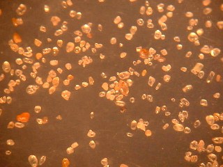 ジルコンを含む砂。ジルコンは無色からピンクだが、 屈折率が高いのが特徴。また外形は四角柱の柱状結晶が特徴的。風化に強く、比重が大きいので、 選別されて残りやすい。