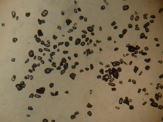 透過光での観察。ジルコンは屈折率が大きく、 そのため粒子境界で光を全反射してしまう領域が大きく、黒く縁取られて見える。 石英の場合はそれほどそれが顕著でないので、簡単に区別できる。